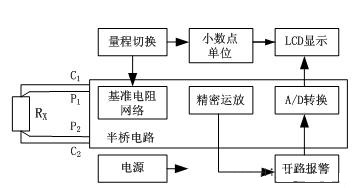 QJ83A数字直流电桥工作原理如图2所示。被测电阻以四线制接入电桥,经基准电阻、精密运放和A/D转换器构成的半桥电路完成R/V变换,LCD显示器显示测试数据,量程切换电路在改变量程网络电阻同时,完成小数点和单位切换。