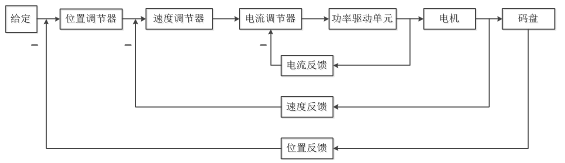 有刷直流伺服电机驱动器:电动机的工作原理和普通的直流电机完全相同,驱动器为三闭环结构,从内到外分别为电流环、速度环、位置环。电流环的输出控制电机的电枢电压,电流环的输入为速度环PID的输出,速度环的输入为位置环的PID输出,位置环的输入即是给定输入,控制原理图如上图。