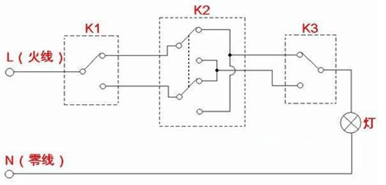 在安装三控电灯开关的时候,大家需要注意的是弄清楚它的工作原理是具体怎么回事。图中的三个开关分别是普通的开关,只是在不同的一些位置而已,火线与零线的位置也很清楚。其实正在起到控制作用的其实还只是1、3这两个开关,而中间的2只是一个中途开关,通过判断1和3的状态来确定自己操作的方式。具体的接线方式请参照下图: